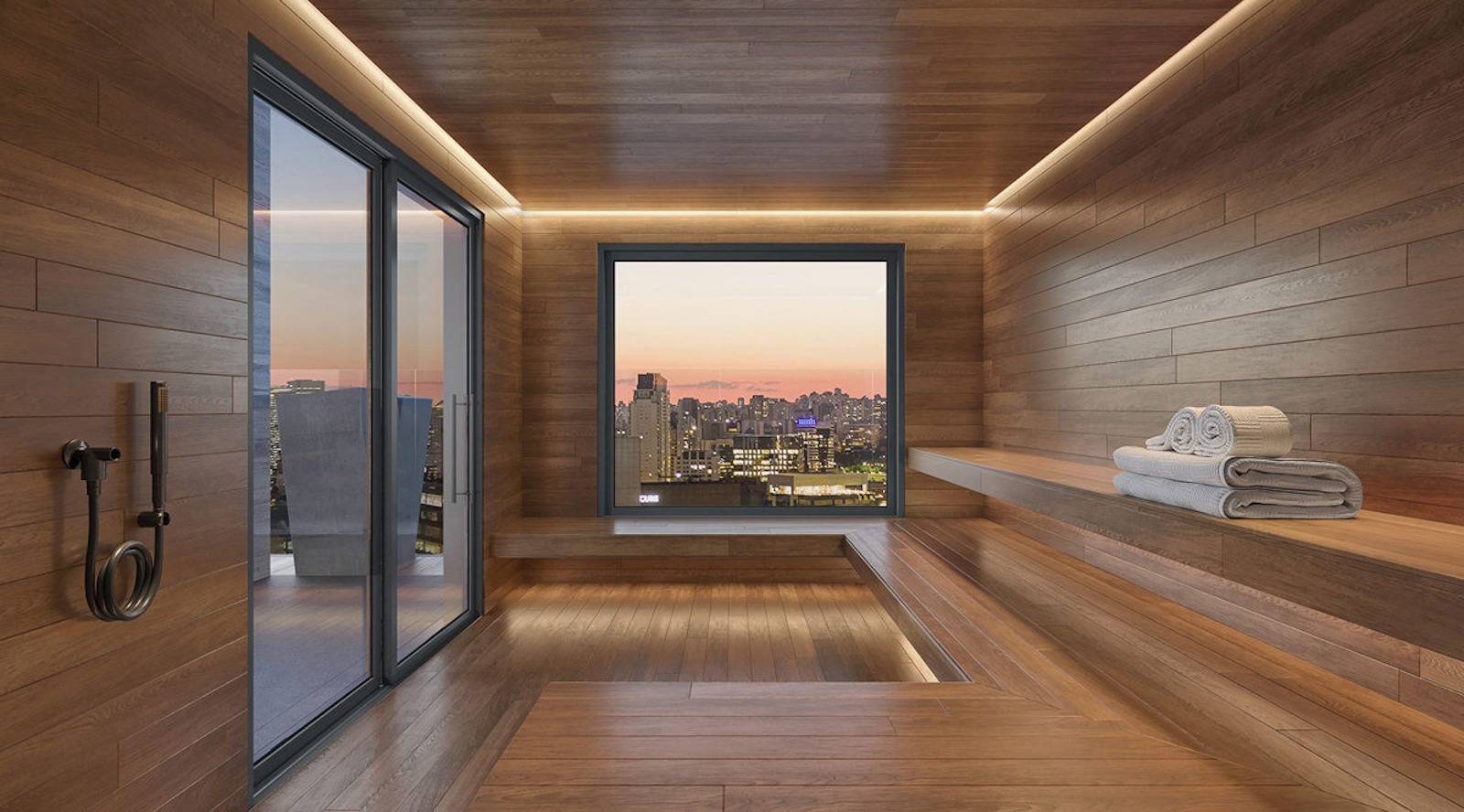 – панорамный rooftop с бассейном на 25 м, сауной, баром и лаунж-зоной на 24-м этаже (79 м высоты);